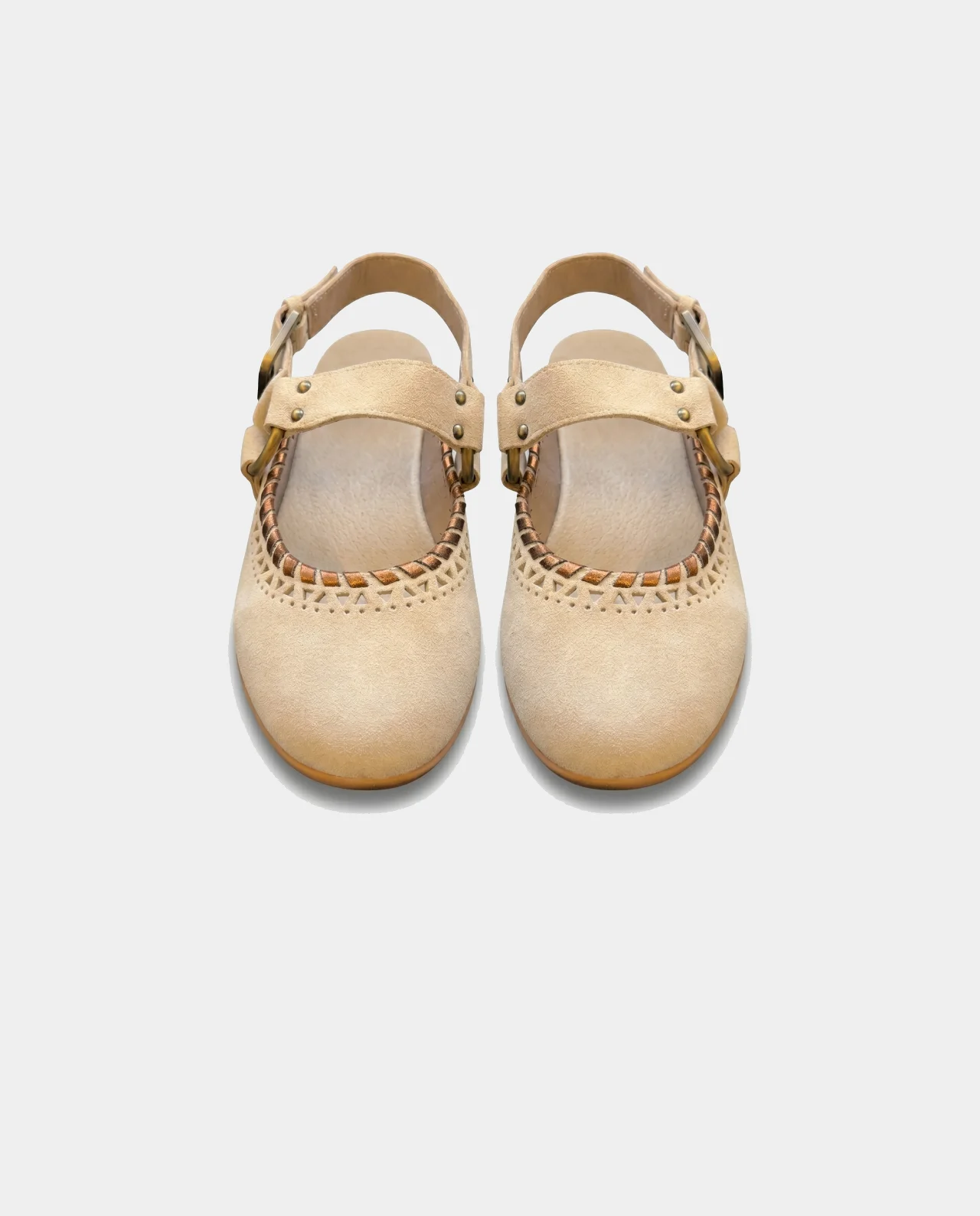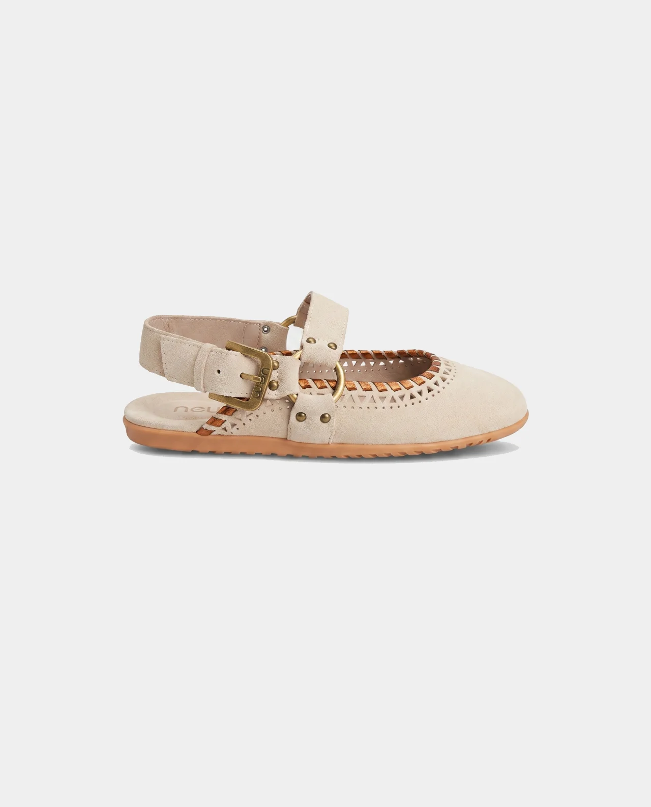 Erleben Sie den Inbegriff von Komfort und Stil mit den MOU CHLK Ballerinas. Diese luxuriösen flachen Schuhe sind aus feinstem Rinds-Wildleder in einem sanften Kreideweiß gefertigt. Einzigartige lasergeschnittene Perforationen und handgearbeitete Ziernähte verleihen diesem Modell einen unverwechselbaren Vintage-Look. Der breite Knöchelriemen mit markanter Bronzeschnalle und Metallringen sorgt für einen sicheren Halt und setzt ein modisches Statement. Dank der robusten Gummisohle ist dieser Schuh der ideale Begleiter für den anspruchsvollen Alltag.