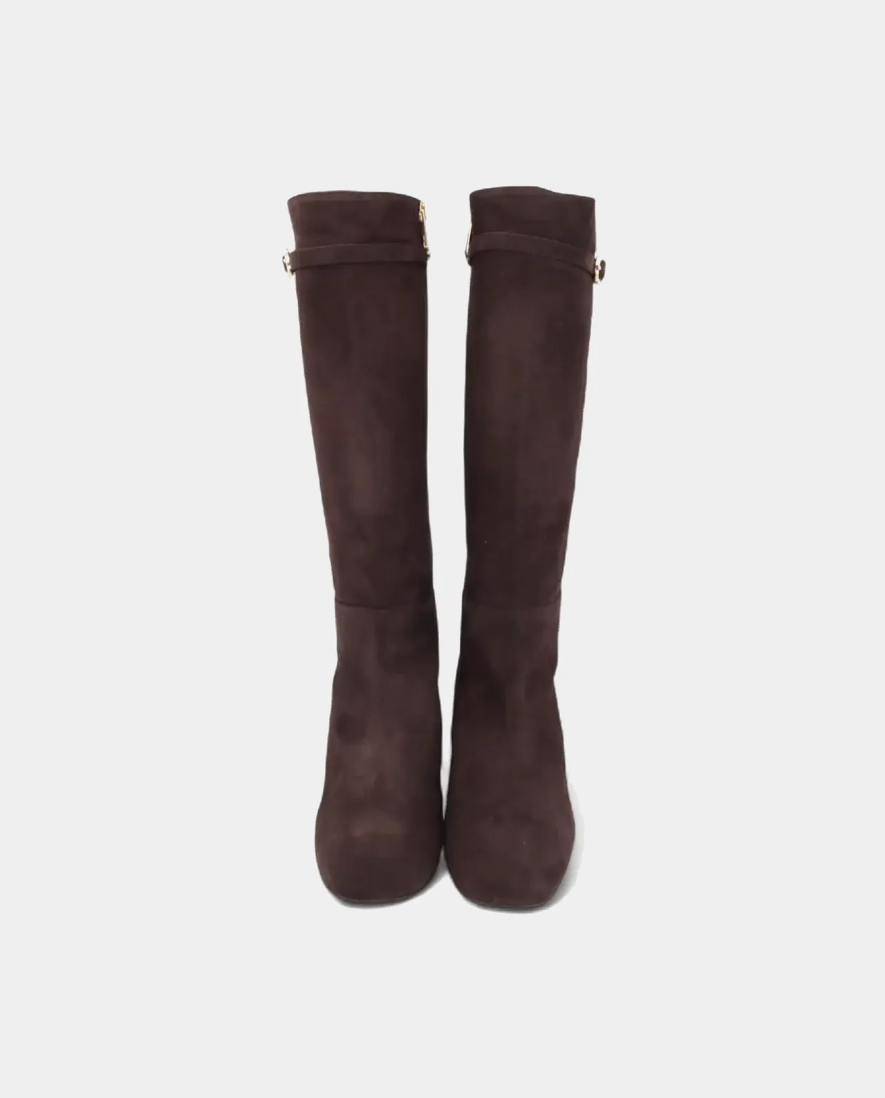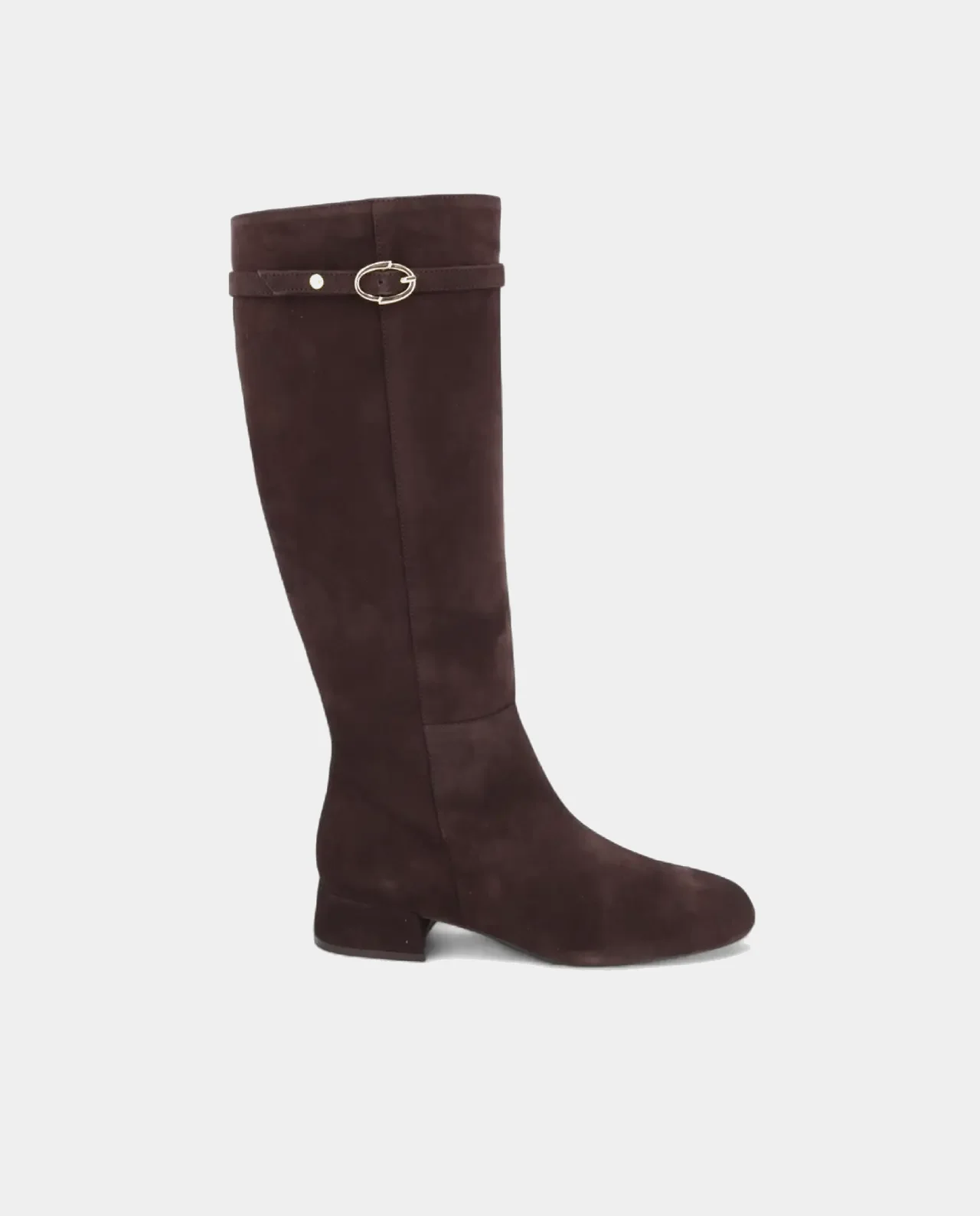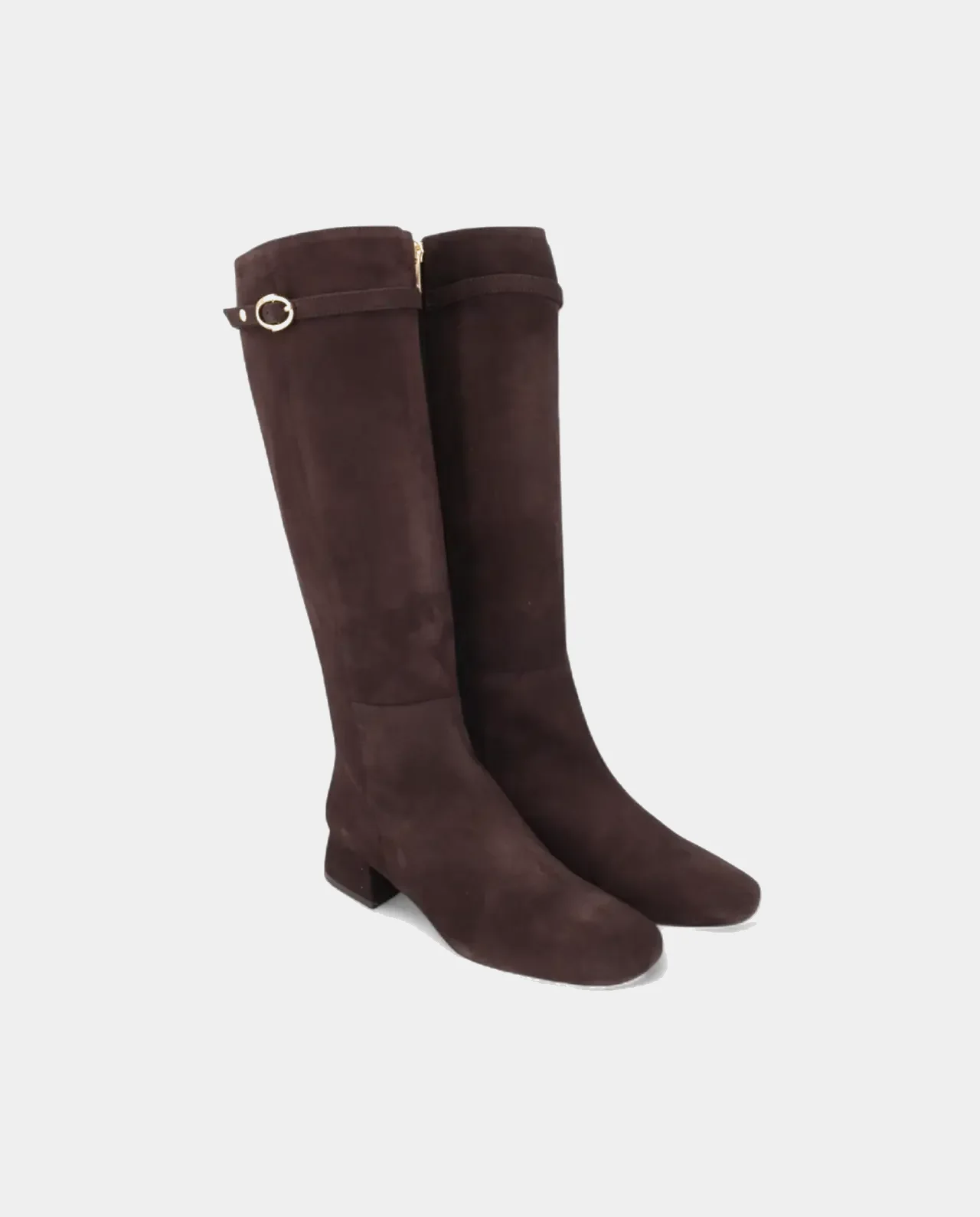 Les bottes hautes Marvella pour femmes sont confectionnées en daim marron profond, alliant savoir-faire italien et sophistication moderne.
