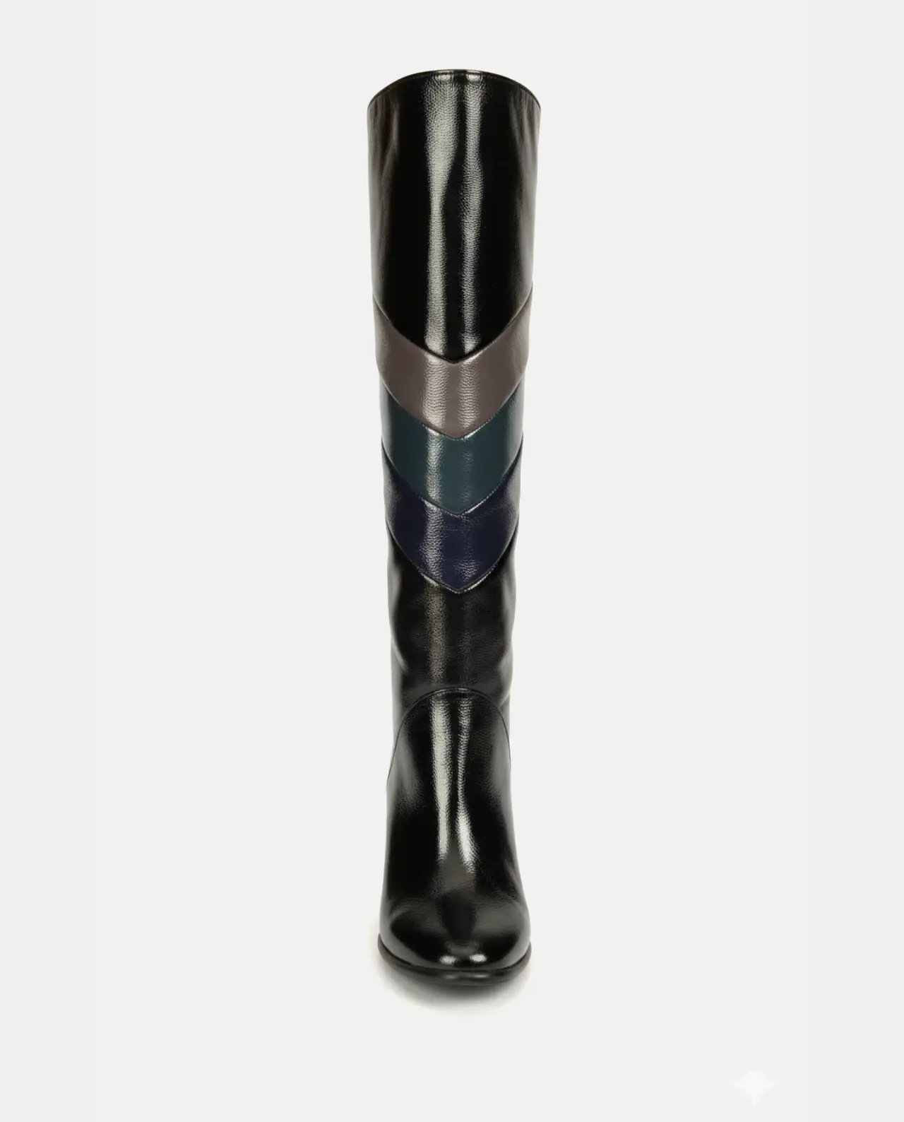 Sa structure distinctive à panneaux chevrons rehausse la silhouette, tandis que le talon épais arrondi offre un équilibre, une stabilité et un confort améliorés, permettant une liberté de mouvement tout au long de la journée. Cette construction unique rend ces bottes idéales pour les femmes dynamiques qui apprécient à la fois le style et la praticité.
