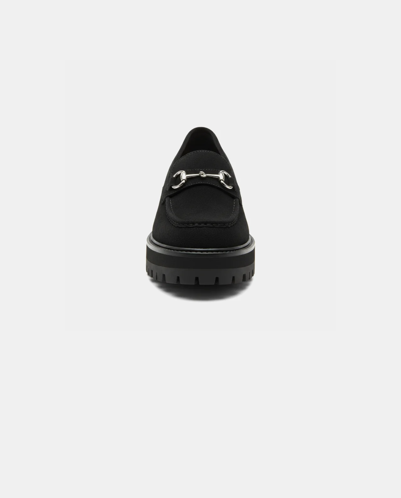 Détails : Dessus : Cuir véritable en daim noir – Doublure : Synthétique – Semelle : Caoutchouc avec bande de roulement crantée – Style : Mocassin pour femmes – Caractéristiques : Bout rond, semelle plateforme, détail de passant métallique