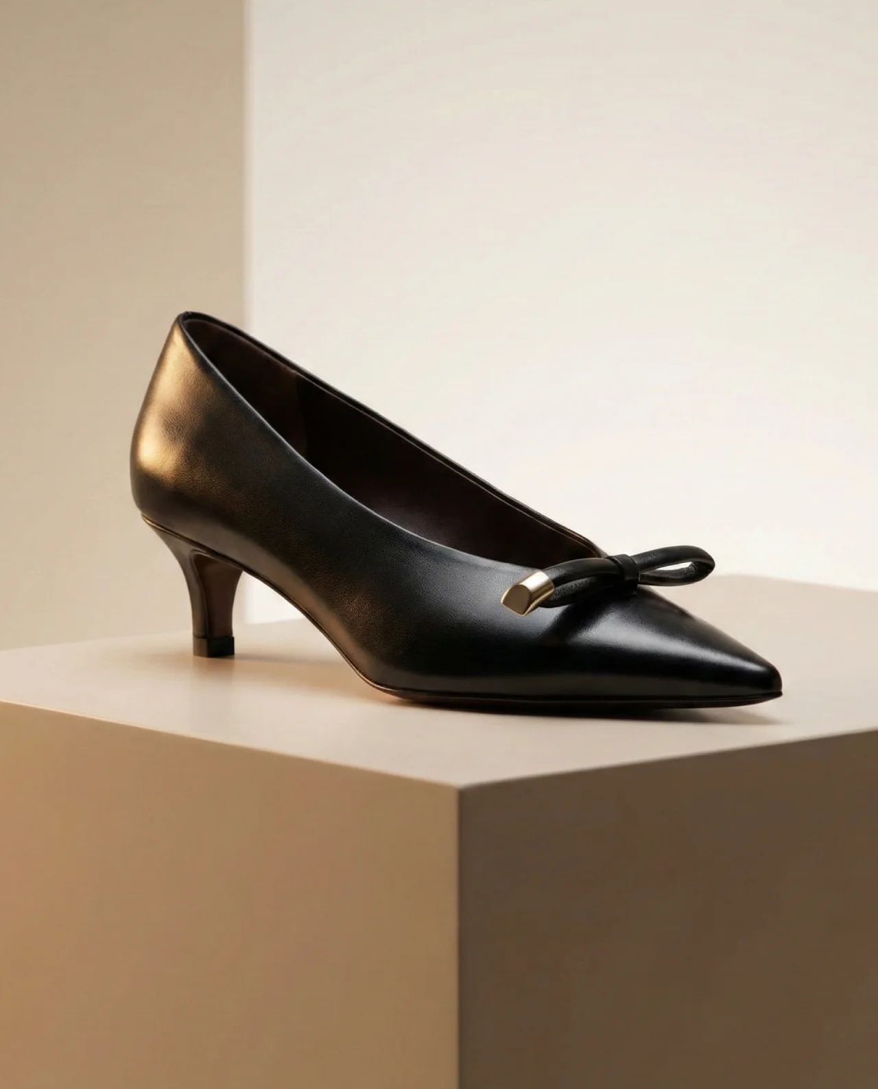 La silhouette pointue allonge la jambe tandis que le nœud décoratif délicat avec détail métallique ajoute une touche de féminité vintage.