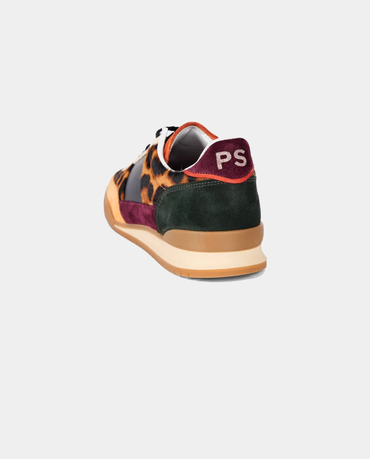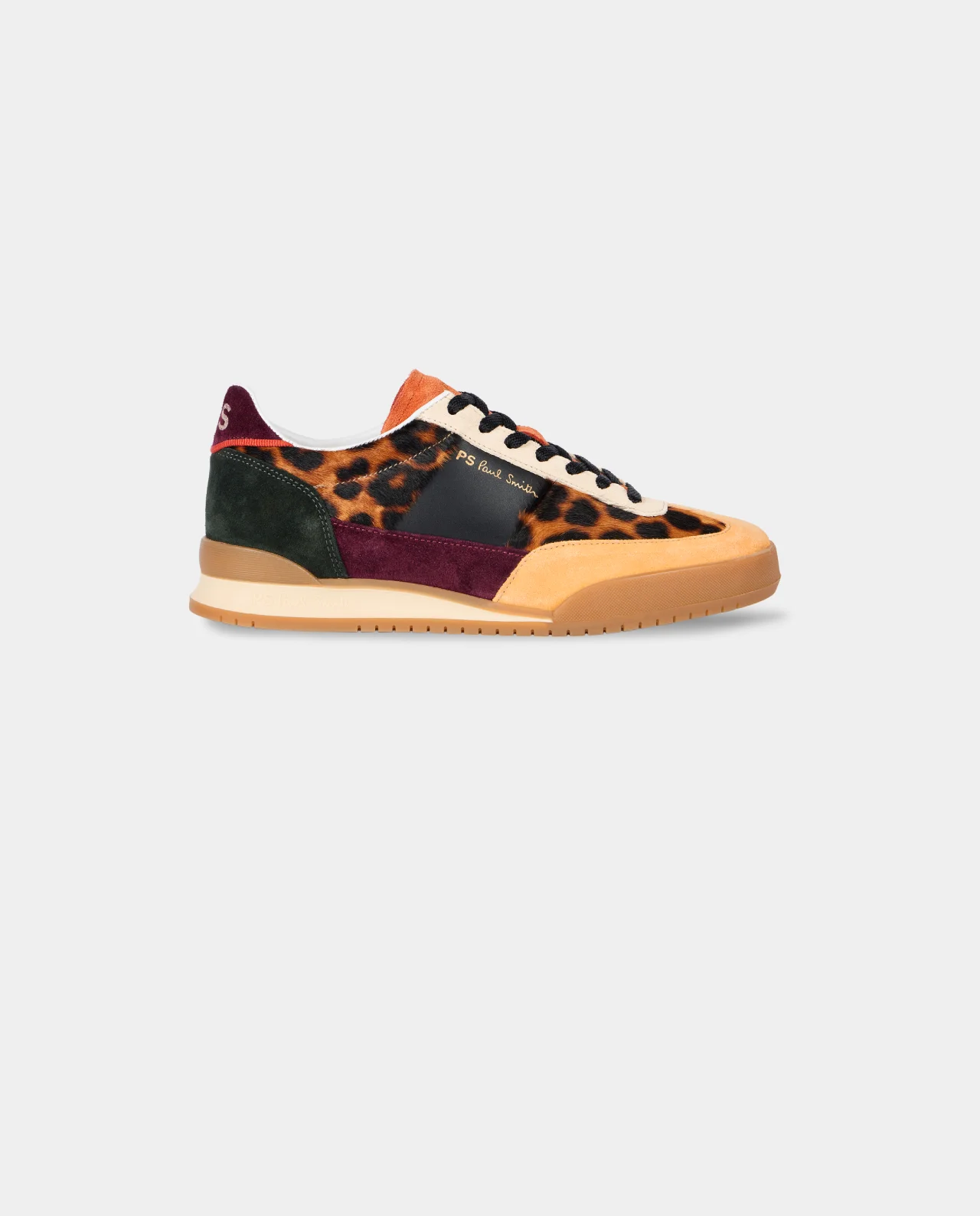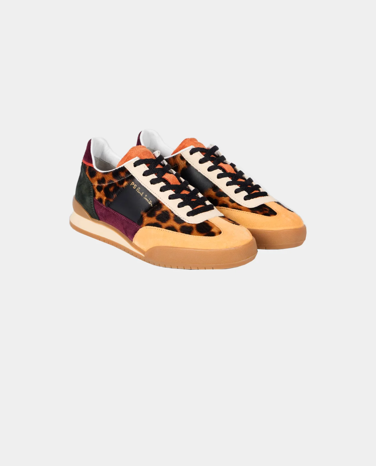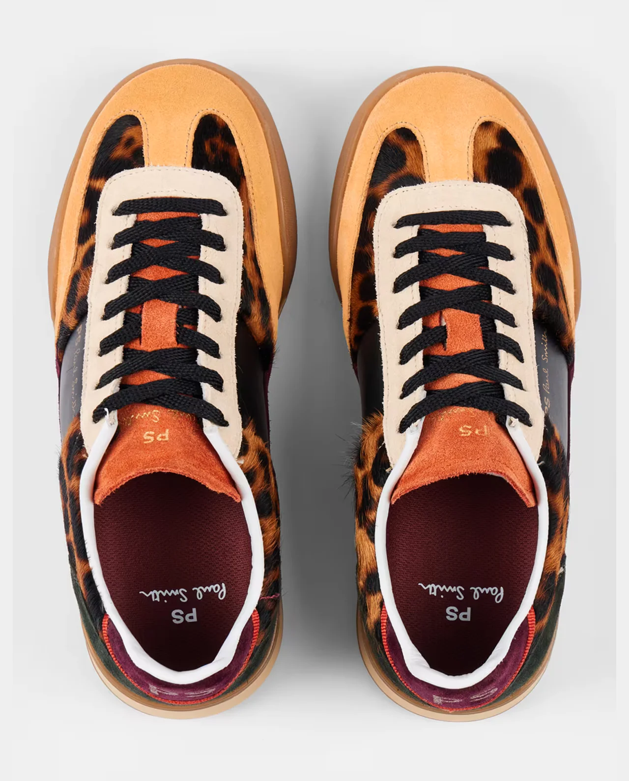 Les sneakers Dover, fabriquées au Portugal, présentent des empeignes en cuir véritable avec des panneaux en faux poulain à imprimé léopard. Conçues dans une palette de couleurs contrastées noir, orange et neutre, elles allient esthétiques vintage et moderne. Un logo contrastant et une marque embossée sur la semelle en caoutchouc ajoutent une touche signature. Lacets supplémentaires inclus.