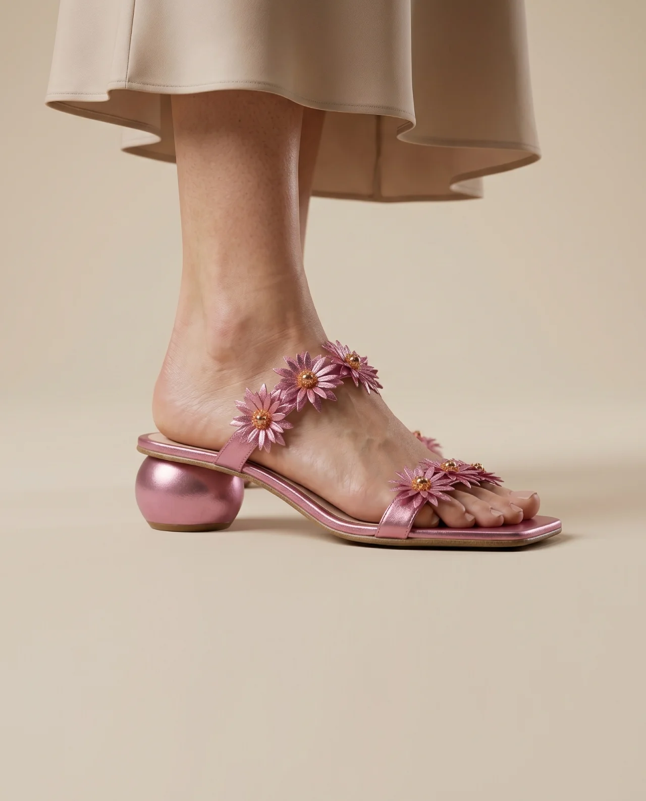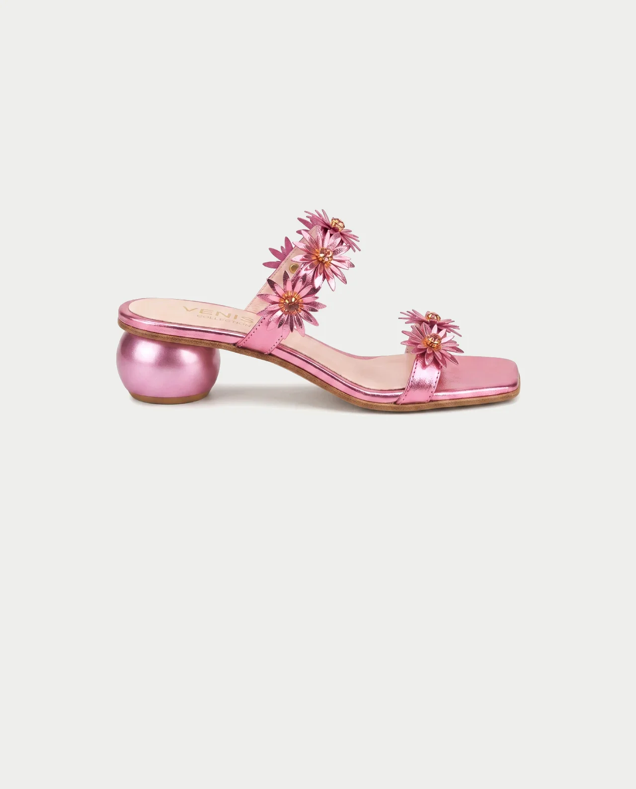 Experience the pinnacle of Italian craftsmanship with the 040 LAME ROSA sandals by Venise Collection. These exquisite mules are crafted from radiant pink metallic leather, featuring a breathtaking garden of 3D handcrafted flowers adorned with sparkling crystal centers. The iconic metallic spherical heel and the trendy square-toe silhouette create an architectural masterpiece. Elegant, feminine, and undeniably bold, these sandals are designed for the woman who wants to leave a lasting impression.