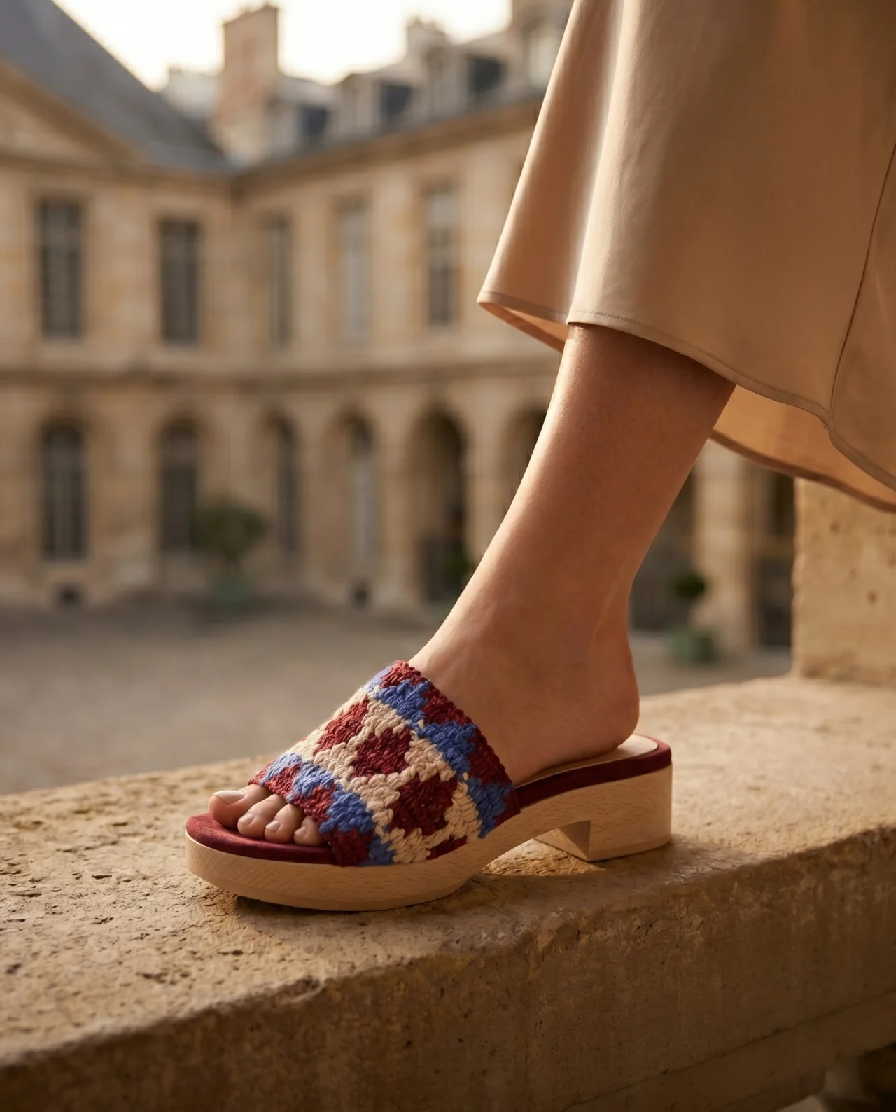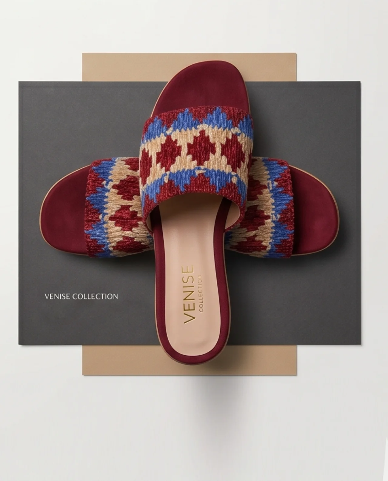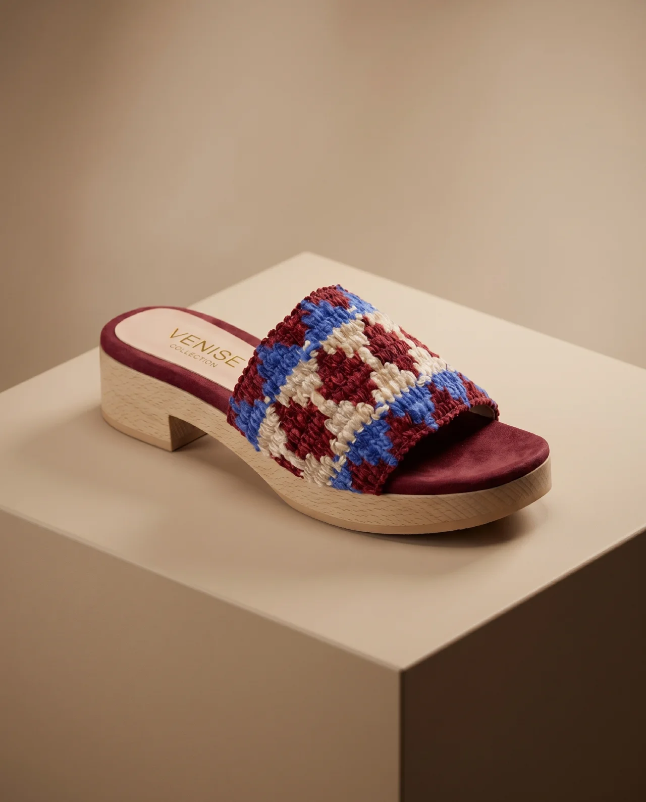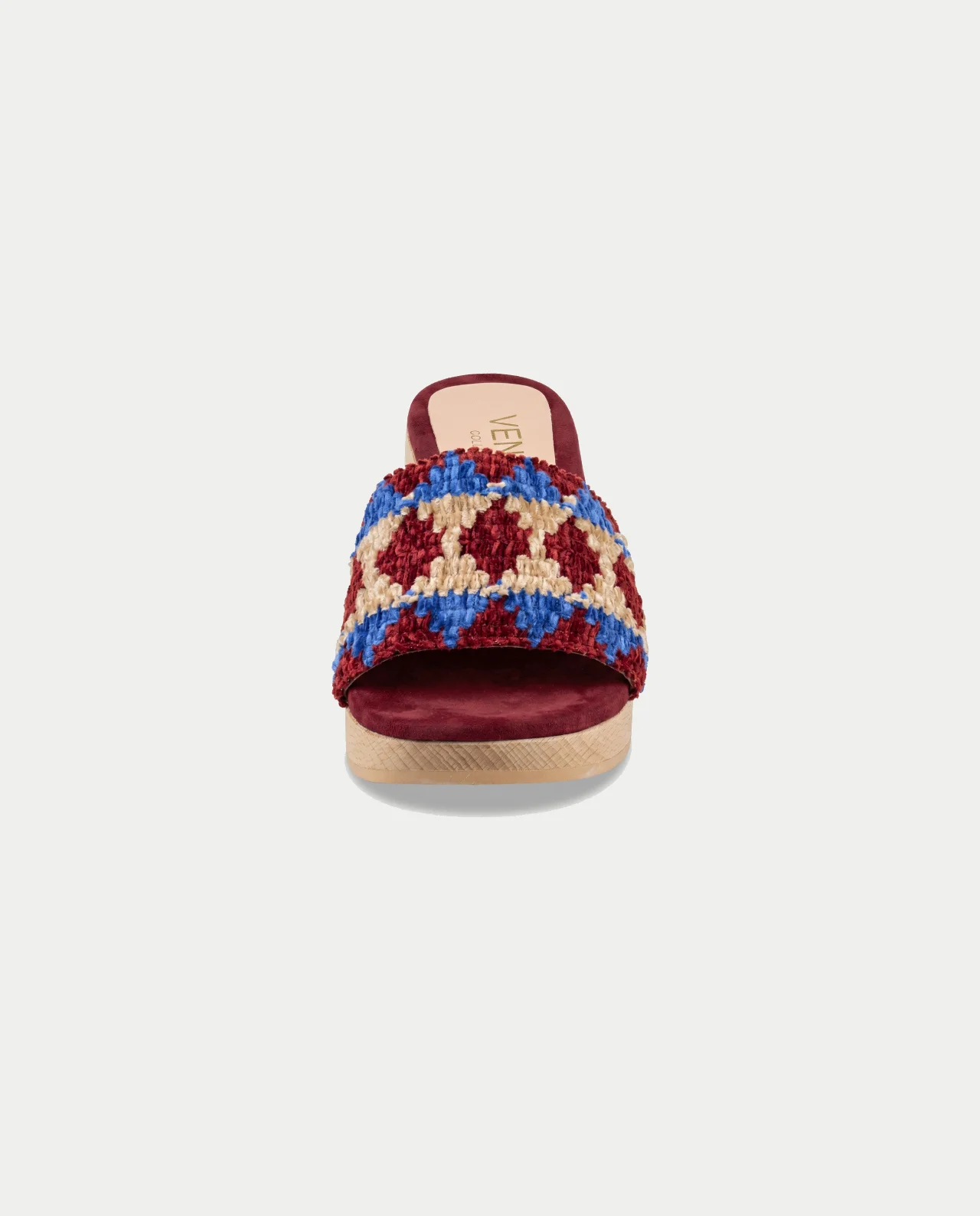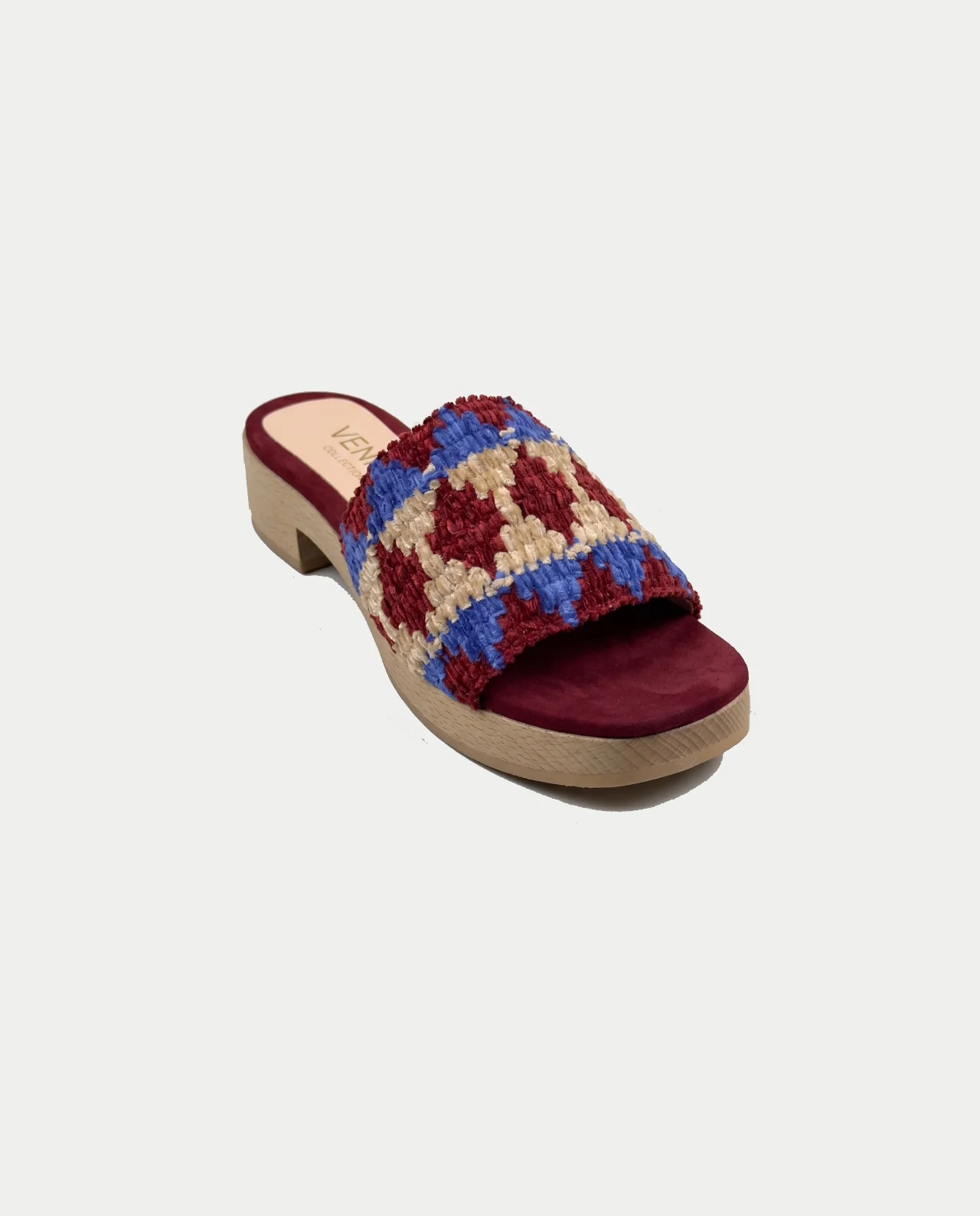 Embrace artistic, effortless style with the Boho Woven Mule Sandals by VENISE COLLECTION. Proudly Made in Italy, these slip-on shoes perfectly balance vintage-inspired design with everyday comfort. The striking upper features a rich, textured woven fabric showcasing a geometric pattern that beautifully blends shades of deep red/burgundy, bright blue, and cream.