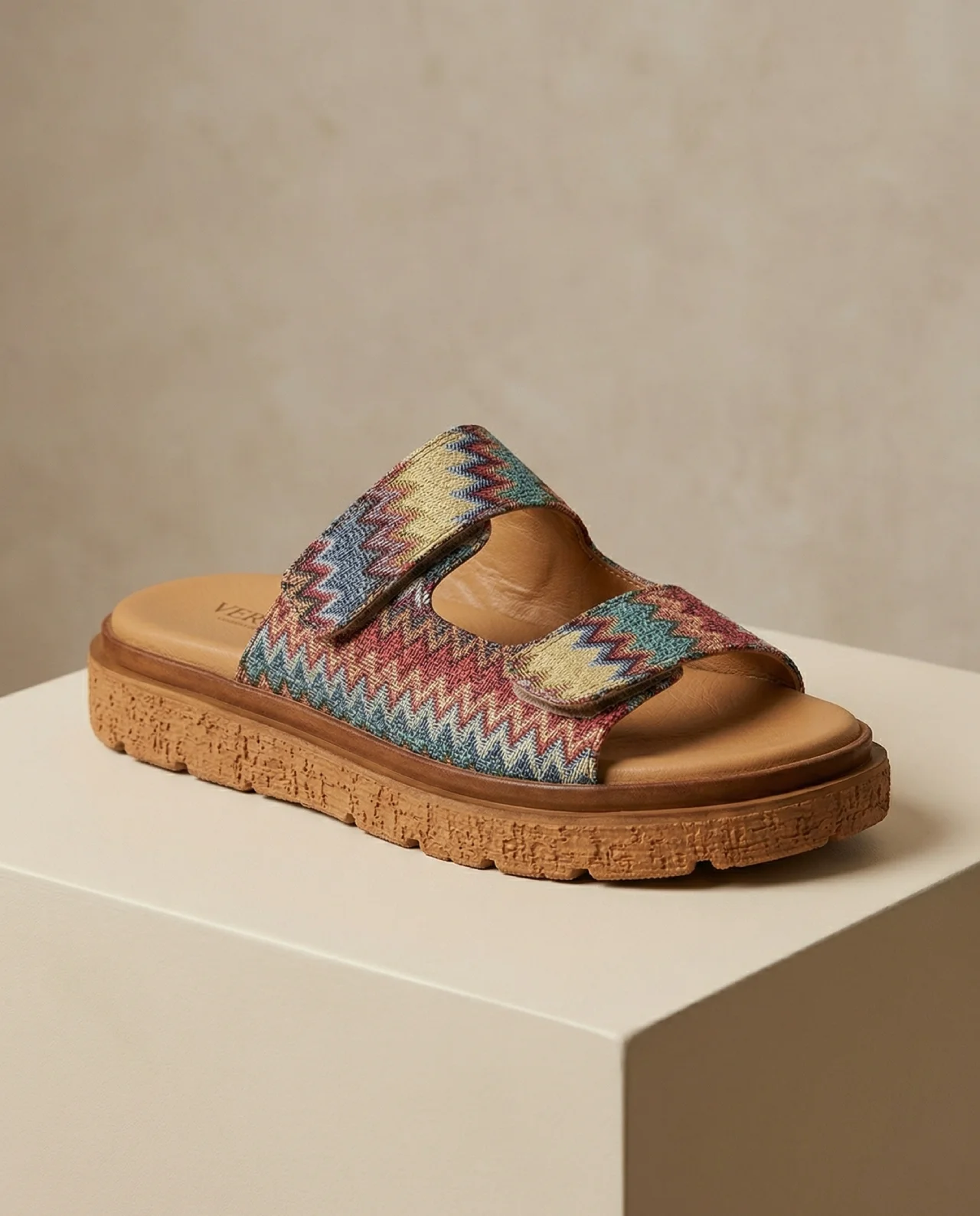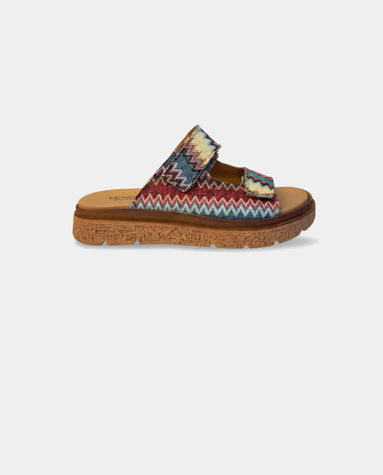 Make a unique fashion statement this season with the 2609-79 sandals by VENISE COLLECTION. Proudly Made in Italy, this exclusive Limited Edition footwear merges artisanal beauty with everyday practicality. The outer upper is crafted from high-quality fabric showcasing a vibrant, multicolored geometric chevron pattern that effortlessly captures a chic boho aesthetic.