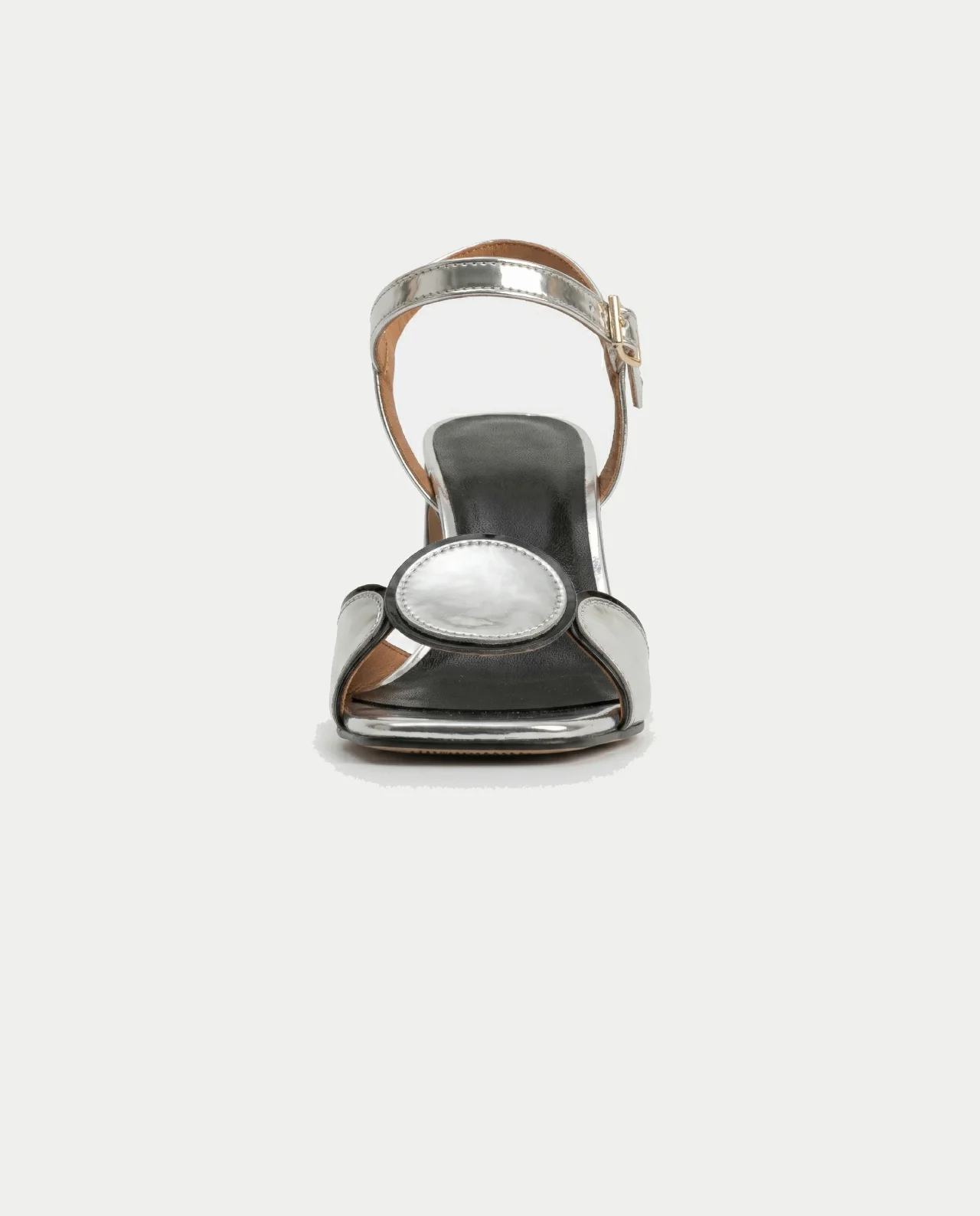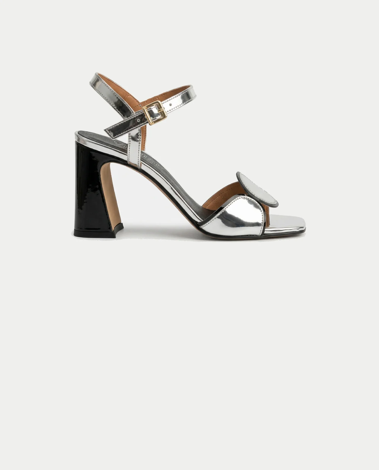 This model features a sturdy, high-gloss black block heel that provides both comfort and a dramatic silhouette. The front is adorned with a signature circular metallic detail over a contemporary square toe. Secured by an adjustable ankle strap with a refined gold-tone buckle, these sandals are the perfect choice for galas, weddings, or any high-fashion evening event.