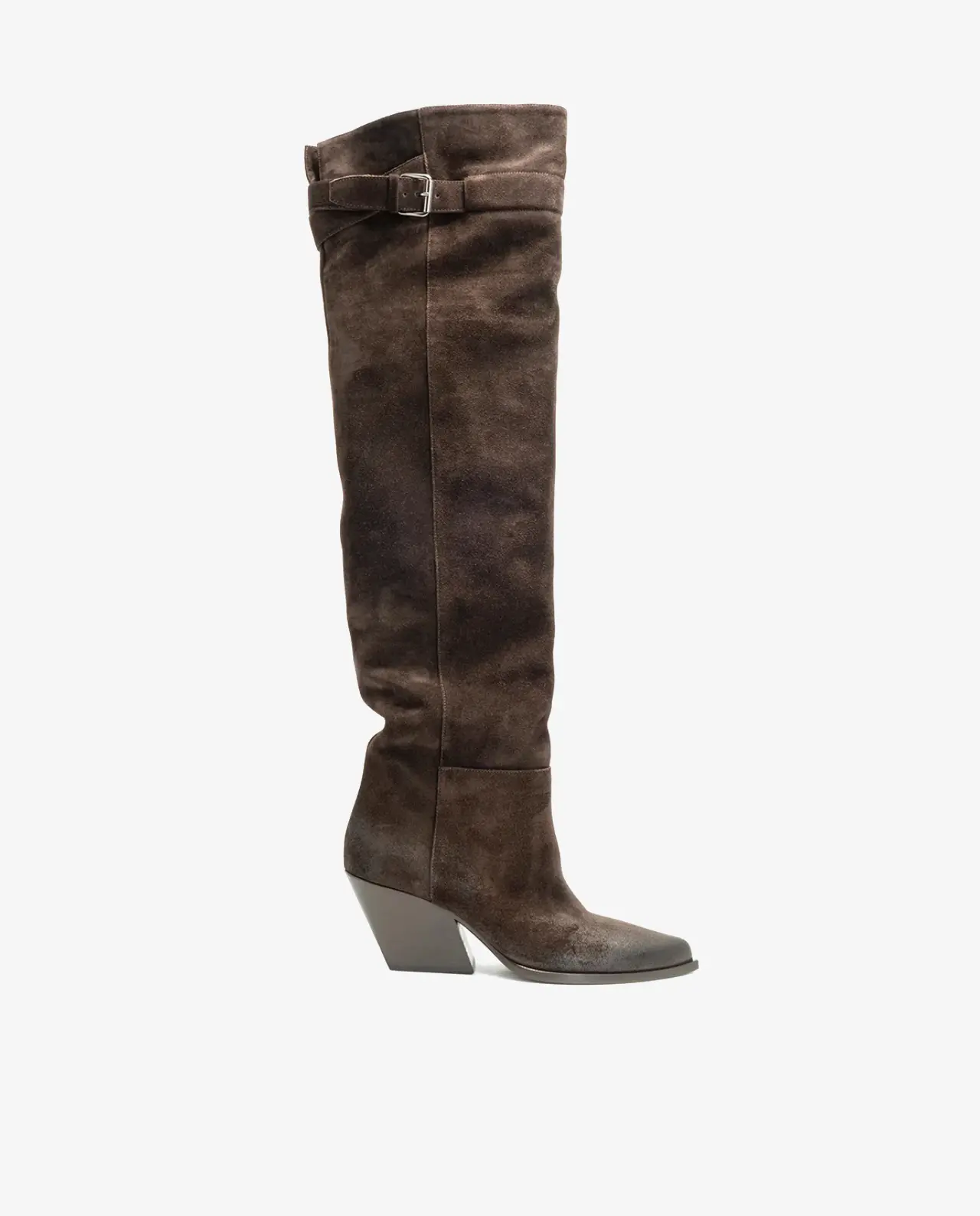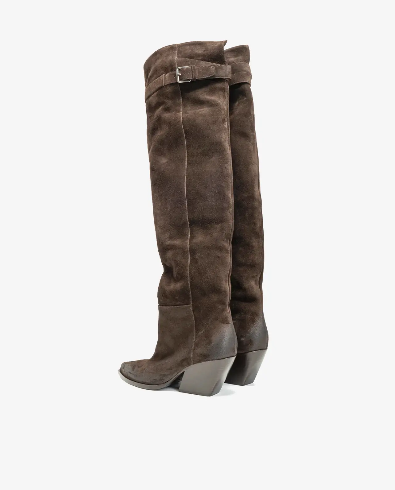 The Marvella women’s tall boots are crafted from deep brown suede, blending Italian craftsmanship with modern sophistication. Featuring a pointed toe, angular 70mm heel, and a sleek buckle detail at the top, these boots exude timeless elegance. Each pair is hand-finished with a unique washing technique, making them truly one of a kind. The leather lining ensures softness and comfort throughout the day.